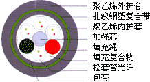 产品型号: GYSTY53也叫(GYTY53) 光纤松套 缆芯填充油膏 金属中芯加强PE内护套 双面涂塑轧纹钢带粘结PE外护套 | ||||